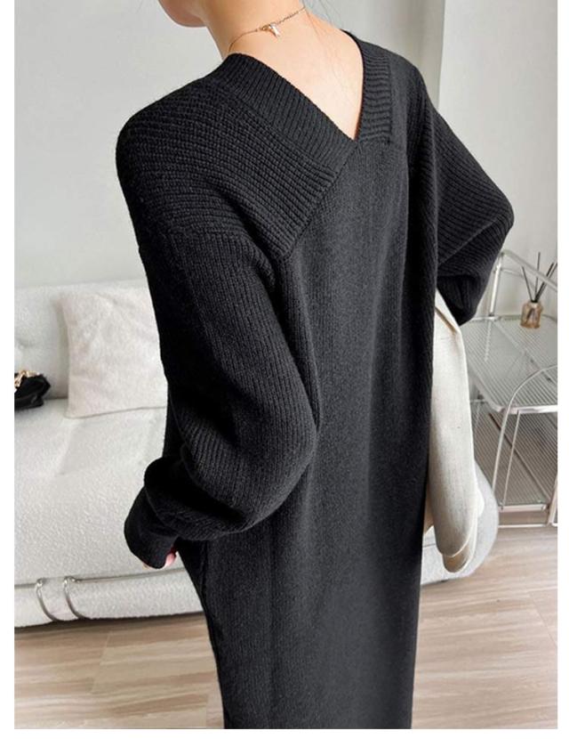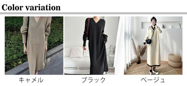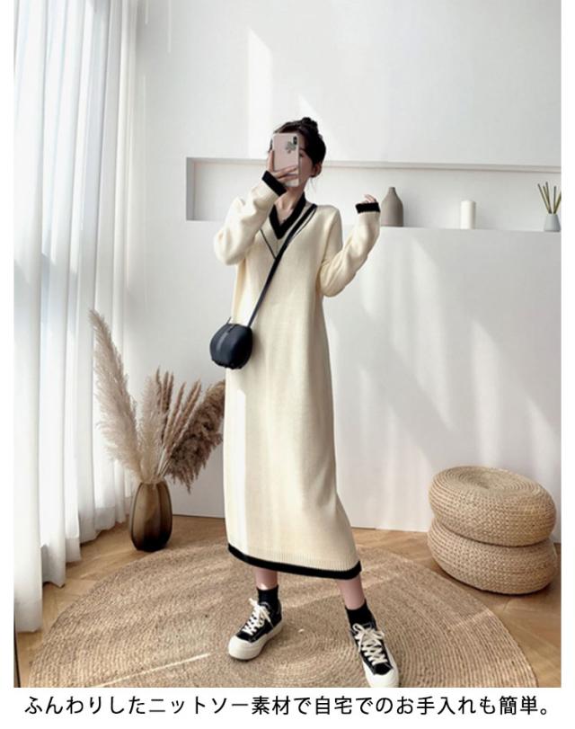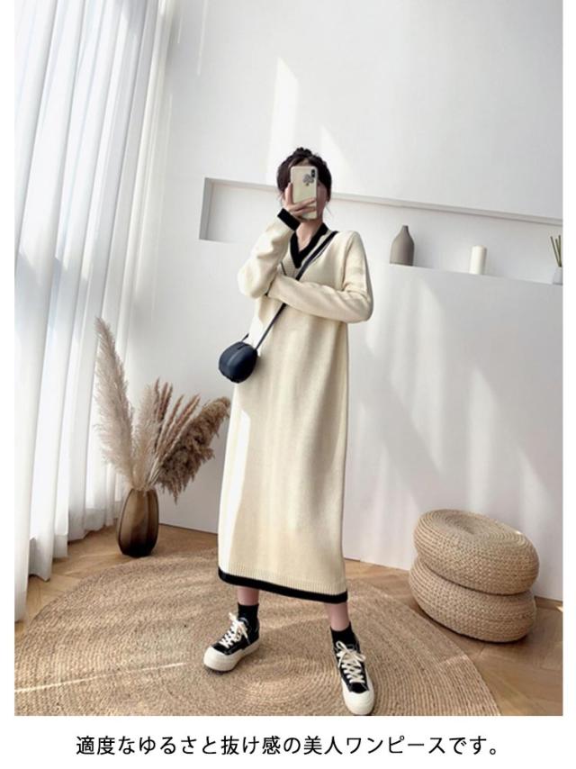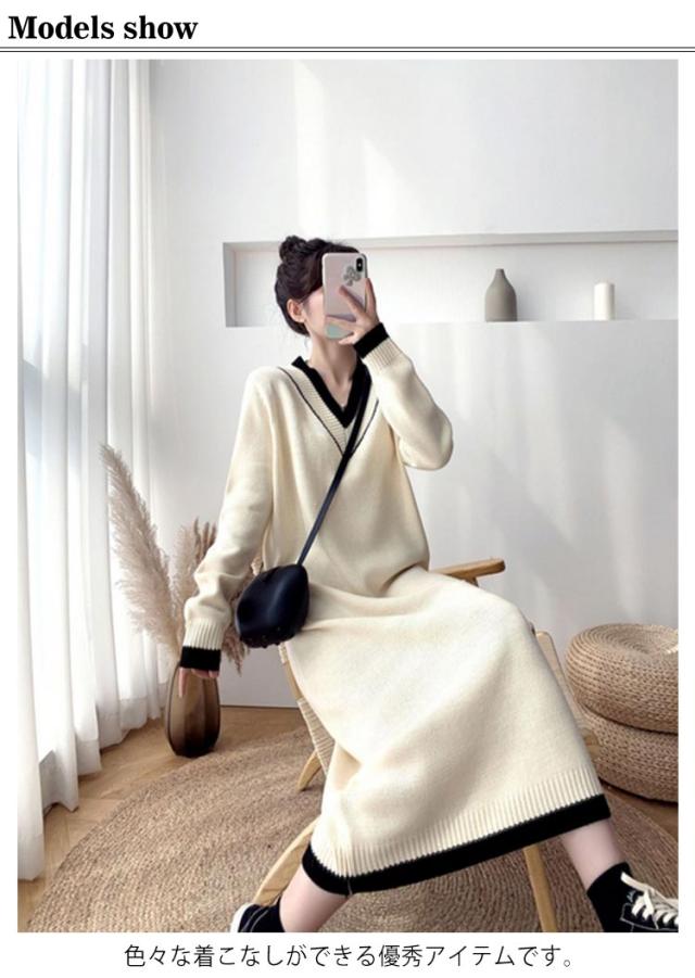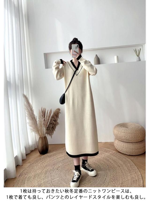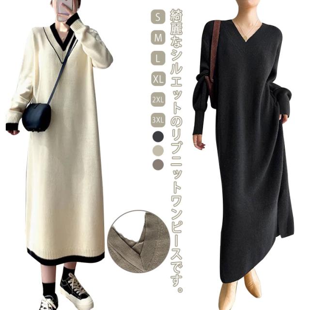 ワンピース レディース Vネック 長袖 リブ ニットワンピース ロングワンピース ロング丈 マキシ丈 秋 冬 ロング ワンピ ロングワンピ マキシ マキシワンピース 無地 ストレート レイヤード ドロップショルダー 体型カバー 大きいサイズ マタニティ 切り替え 送料無料
