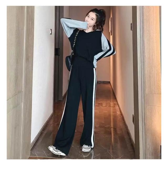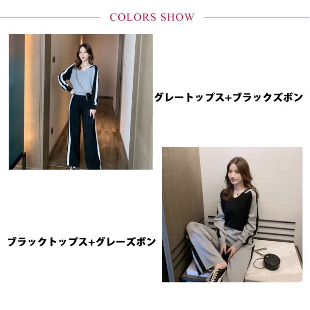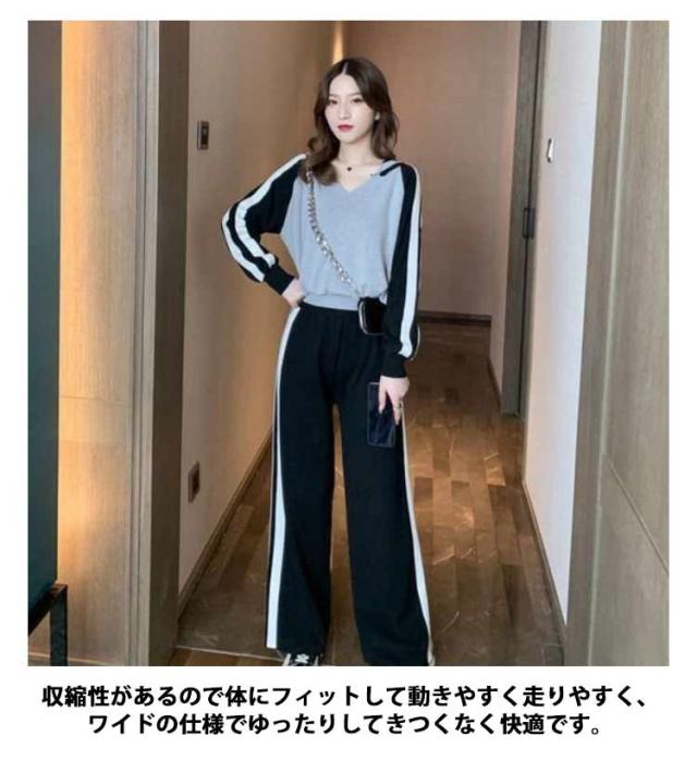 ジャージ レディース セットアップ レディース パンツセット パーカー きれいめ カジュアル おしゃれ Vネック ジャージ ワイドパンツ ハイウエスト ブラック 黒 グレー 20代 30代 40代 50代