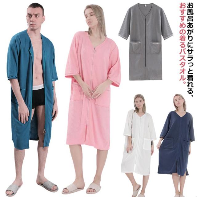 着るバスタオル バスタオル バスローブ レディース メンズ ルームウェア ラップタオル ワンピース ワッフル生地 前開き ジップアップ Vネック ゆったり 薄手 大人 湯冷め防止 プール スイミング 海水浴 温泉 大きいサイズ 春 夏 秋