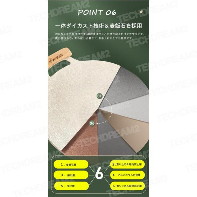 【真麦飯石を採用、安心&安全】一体ダイカスト技術&麦飯石を採用、油がなくでも焦げ付かず、調理後はサッとを拭き取るだけで大丈夫です更に錆びることも心配し必要なく、お手入れがとでも簡単です。