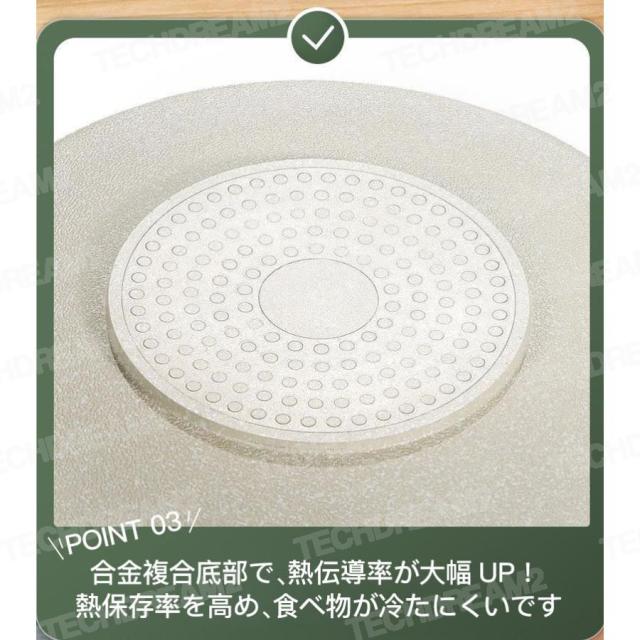 【熱伝導均一】周りが中心より高くなる設計で、 熱伝導は従来品よりもっと速いです。 更に熱伝導は均一であり、 料理も簡単になって、 食感も美味。