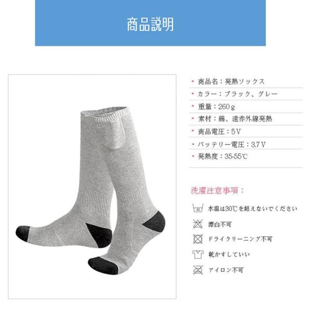 【パッケージ内容】ソックス本体×1足、2200mahバッテリー×2(左右各1)、USB充電ケーブ×1