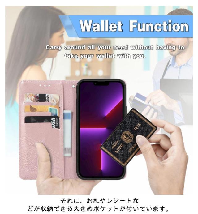 | 【対応機種】iPhone 【素材】PUレザー TPU 【セット内容】スマホケース(iPhone本体は同梱されておりません) 【特徴】 可愛いマンダラの型押し模様で高級感たっぷり。 ポケットやバッグの中にもスッキリ収納できる薄型手帳ケース。 内側には交通系カードやクレジットカードが入るカードポケットを搭載。 それに、お札やレシートなどが収納できる大きめポケットが付いています。 お出かけ際に、これだけを持っていけば十分! スマホを横置きできるスタンド機能で長時間の動画視聴もらくらく!新幹線、飛行機の中での暇つぶしに最適です。 使いやすさを重視し、快適な開閉ができるような磁力に設計しました。 上品な質感のPUレザーを使用し、触り心地や耐久性も抜群。 カメラレンズ周囲の穴に段差を設けることによって、iPhoneの突出したレンズを保護。 | |