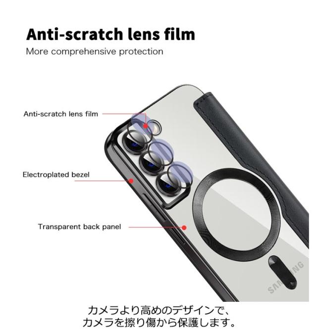 | PUレザー+TPUGalaxy専用ケースです。 スタンド機能を備えており、好きな角度で映画、動画などを鑑賞できます。 カードを収納できるポケットがついています。 カメラより高めのデザインで、カメラを擦り傷から保護します。 ケースを装着した状態でのワイヤレス充電(Qi充電)とMagSafe充電に対応しています。 | |