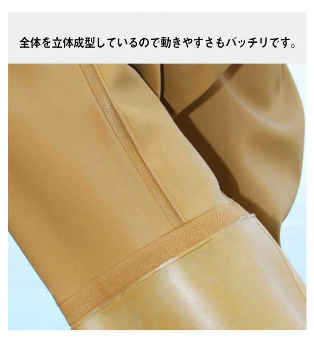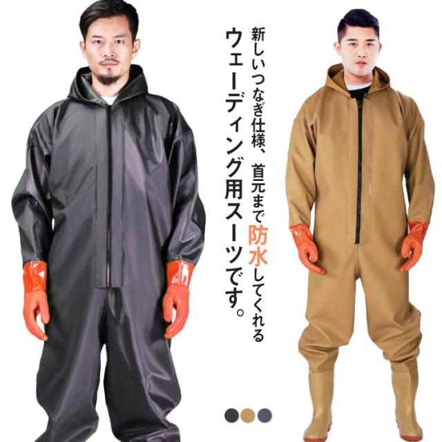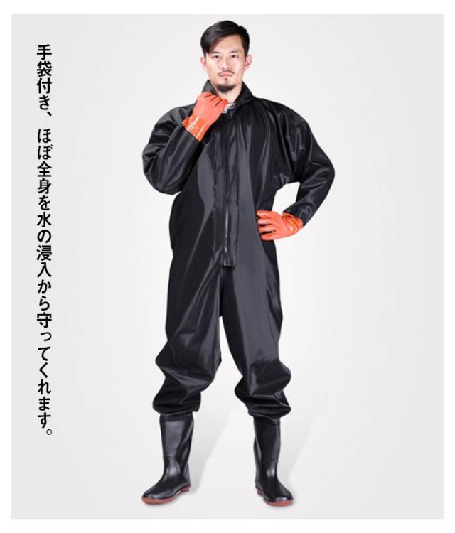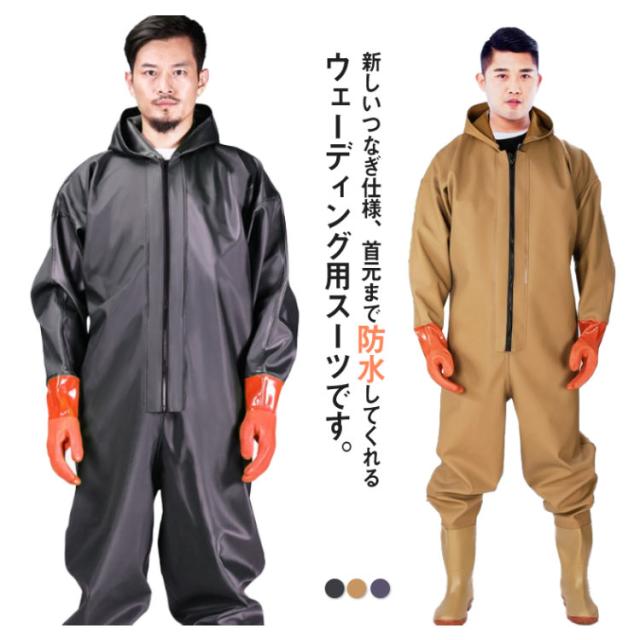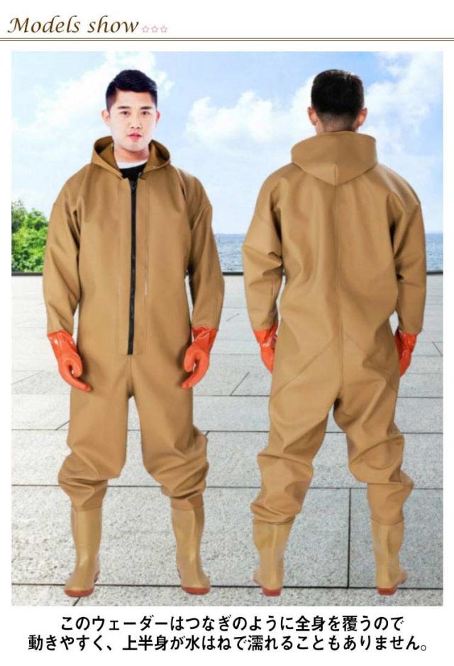 | 新しいつなぎ仕様、首元まで防水してくれるウェーディング用スーツです。 手袋付き、ほぼ全身を水の浸入から守ってくれます。 このウェーダーはつなぎのように全身を覆うので動きやすく、上半身が水はねで濡れることもありません。 フード付きで全身をすっぽり覆ってくれる防水着なので、雨天の作業でも雨風からあなたの体をしっかりガード。 レインコートのように豪雨ではだけることもないので、台風などの緊急時の救護作業でも威力を発揮します。 素材は厚手のPVCで傷つきにくく、水の侵入はもちろん外気からも肌をしっかり守ります。 胸ファスナーも水の侵入を防ぐ仕様で、さらにその下にも防水布を装備。 全体を立体成型しているので動きやすさもバッチリです。 漁業や農業、工事現場など様々なシーンで活躍してくれる防水着です。 | |
