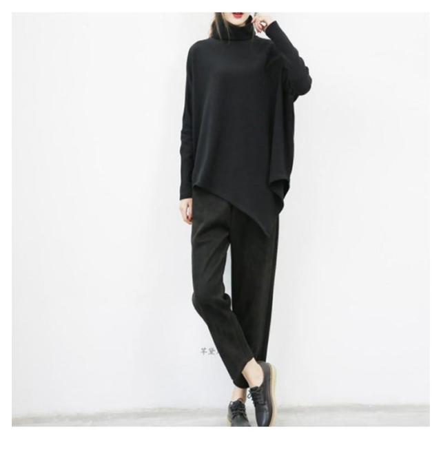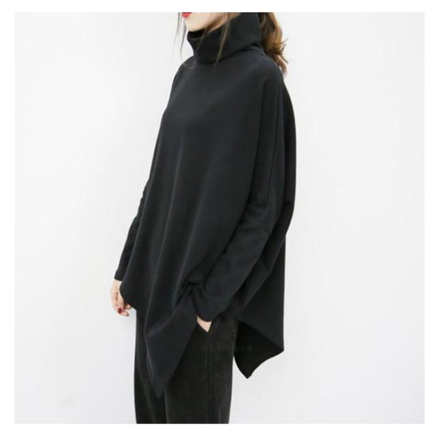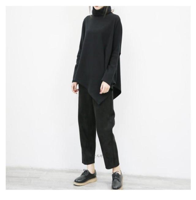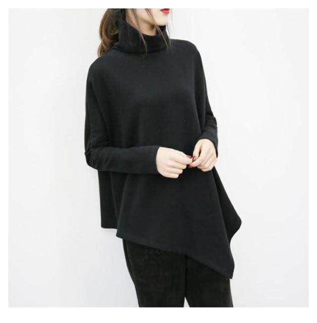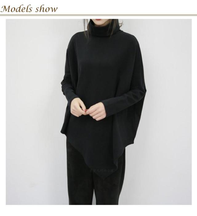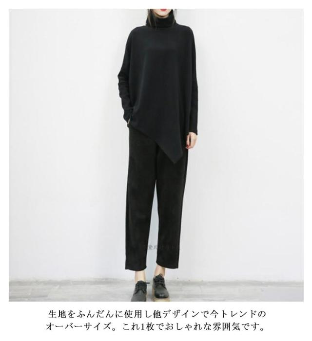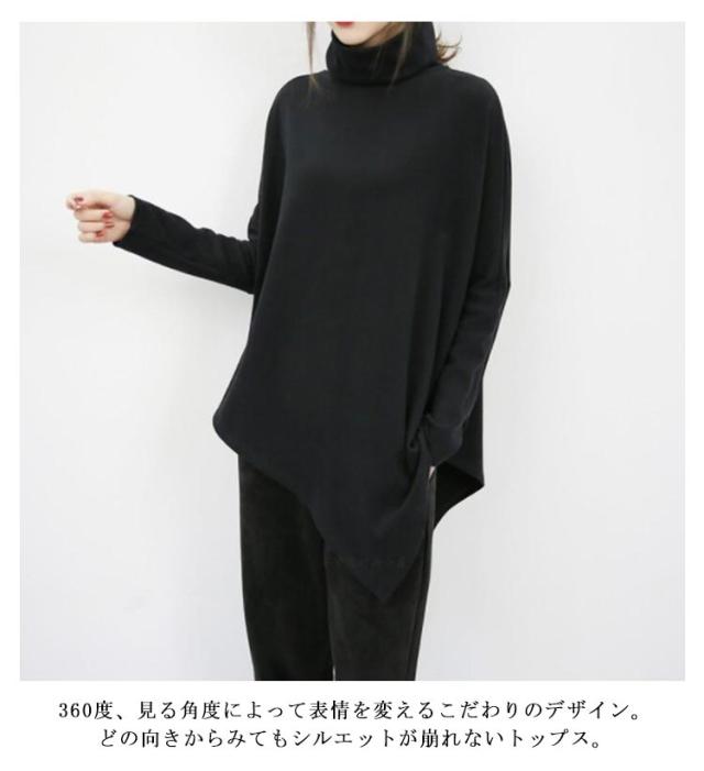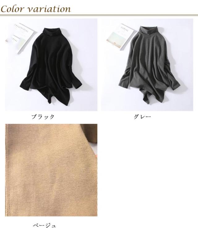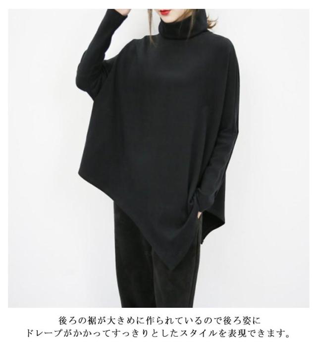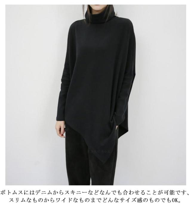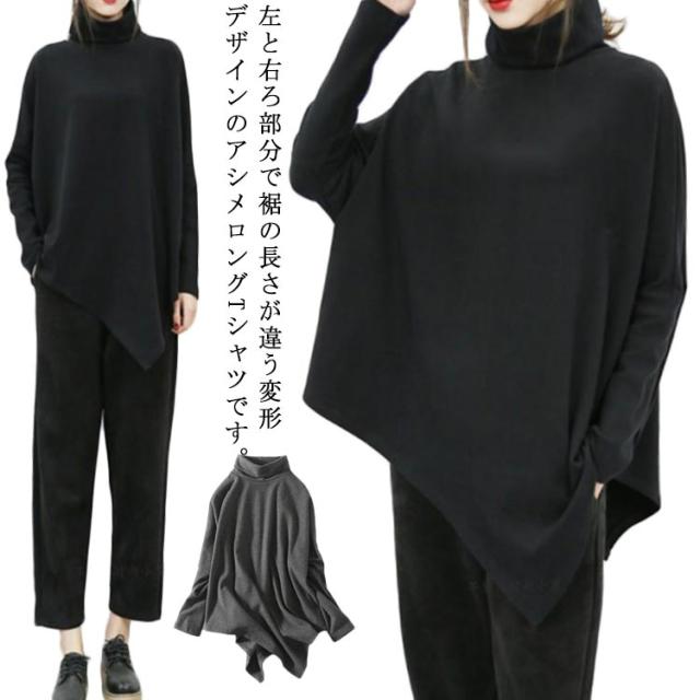 裾変形デザイン アシンメトリー ロングTシャツ モード トップス 長袖 ドレープ カットソー Tシャツ タートルネック ハイネック アシメ チュニック プルオーバー ゆったり 体型カバー カジュアル 送料無料 ブラック グレー ベージュ