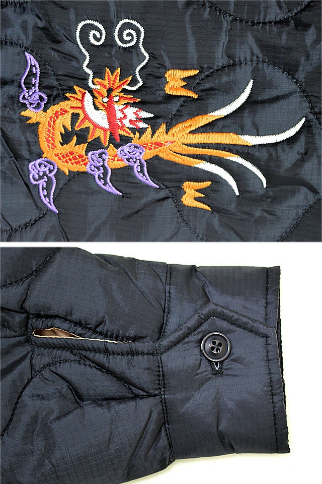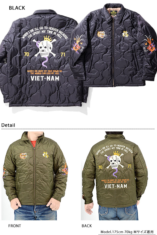 日本で初めてオリジナルのフライトジャケットを生み出し、その後も数々の国内製ミリタリー商品を製造する「ヒューストン」から、ナイロンリップベトナムジャケット「SKULL」(51266)のご紹介です。 高い耐久性を持つナイロンリップに、中綿にはリサイクルシンサレートを使用した、保温性も優れているキルティングベトジャンです。 フロントはジップアップ仕様。 両胸にはベトジャンらしい虎と『福』の刺繍が施されています。 袖口はシングルボタン仕様で、ロールアップがしやすく、袖には龍の刺繍をデザインしました。 フロント両サイドには片玉縁のスラッシュポケット、裏地左胸部分には内ポケットを装備。 裏地は高級感漂うブロンズカラーを採用。 | |||||||||||||||||||||||||