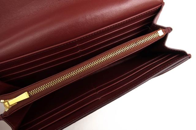 グレインドカーフスキンをベースに、箔押しロゴをあしらったシンプルなモデル。お札は2ヵ所に分けて入れられ、カードは15枚、ポケットが計3ヵ所と収納力抜群です。