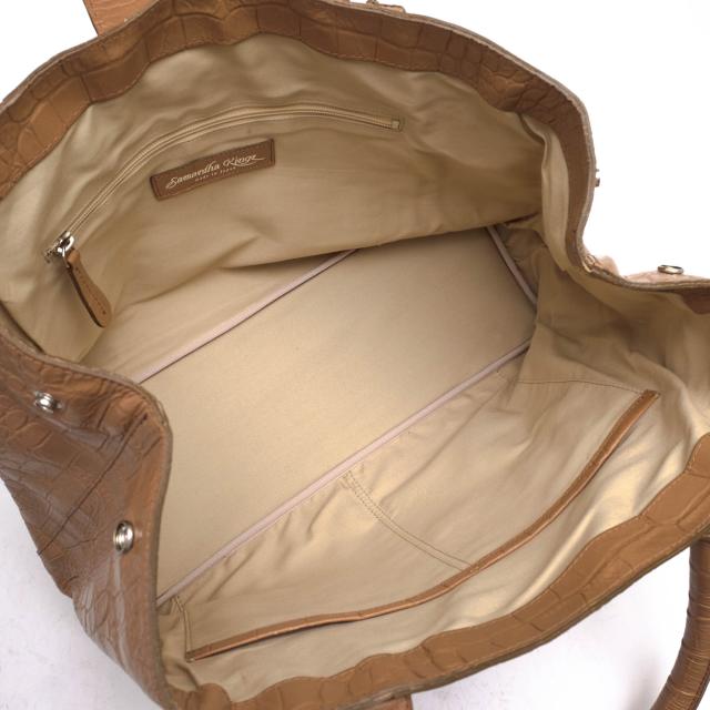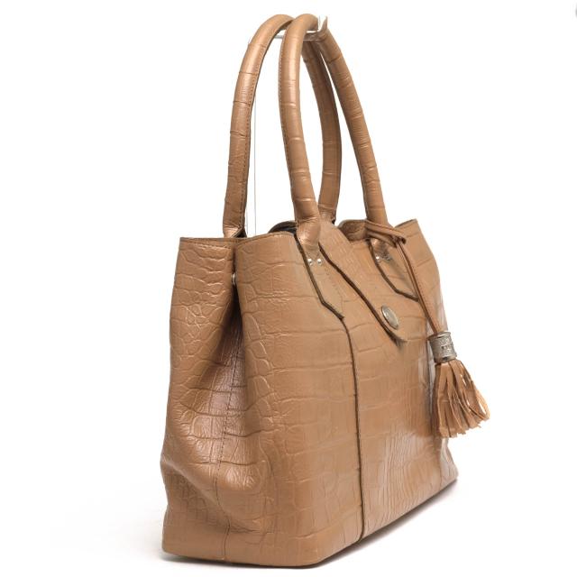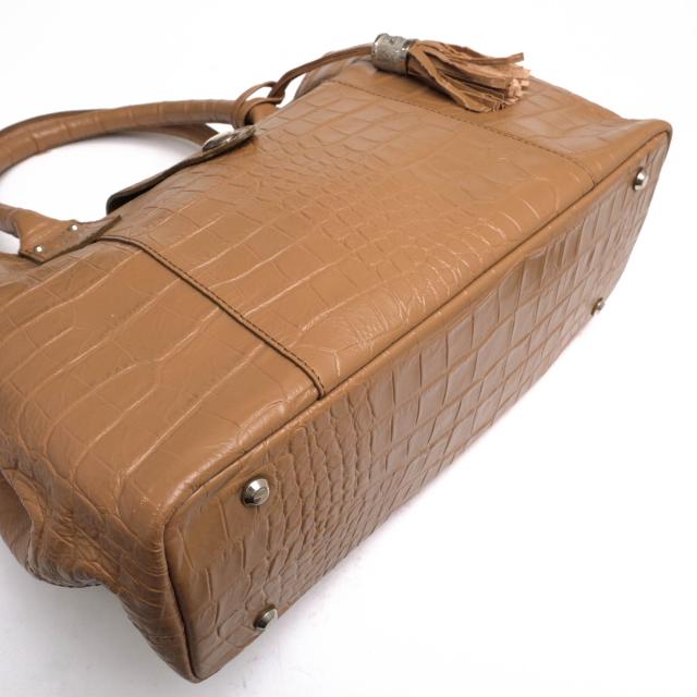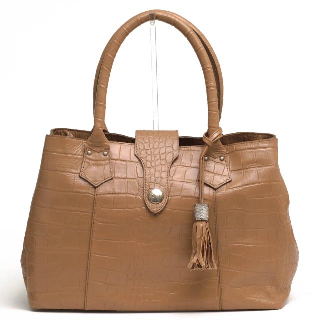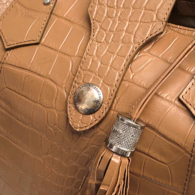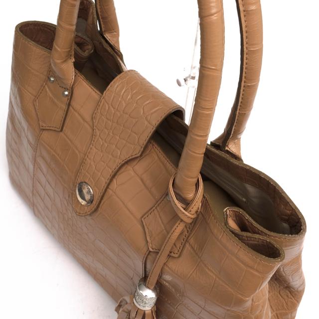 クロコダイルの型押しを施したピート(中サイズ)。太めの糸でザックリと縫製、流行のタッセルをあしらい、革の厚みを活かした切目仕様が美しいです。サイドのスナップボタンで、上部マチ幅の調節が可能です。