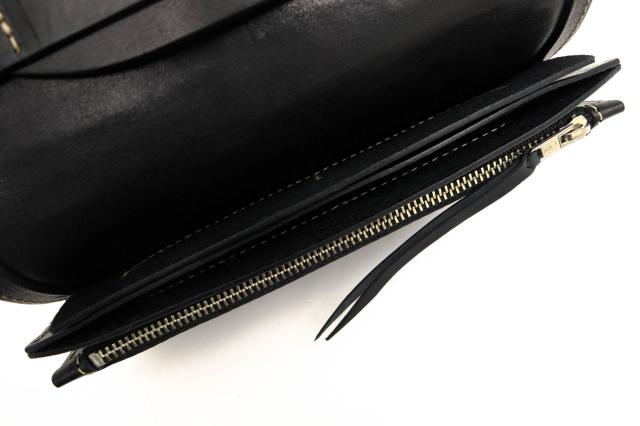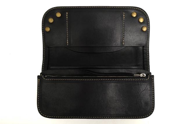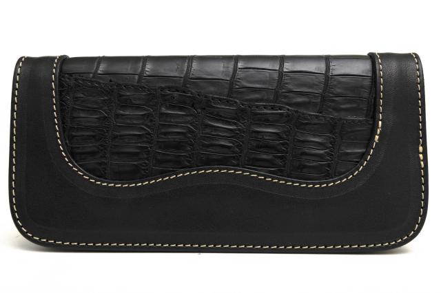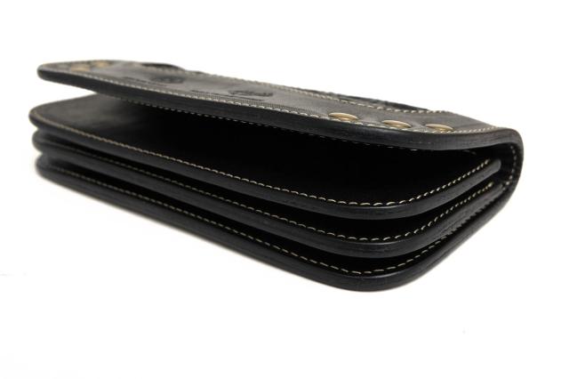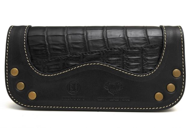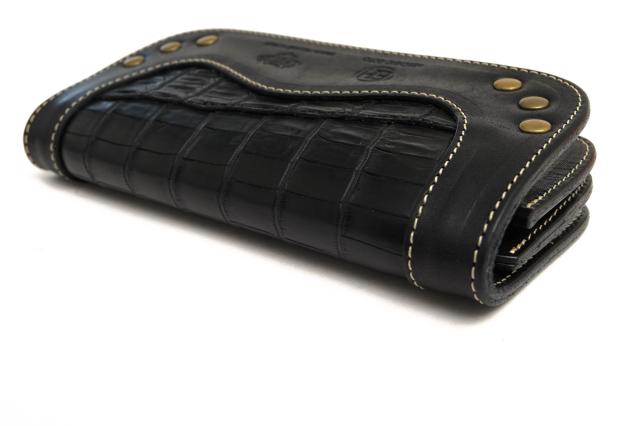 REDMOONインナーと呼ばれるロングセラーモデル。インフレームにスモールクロコダイルを贅沢に使用。肉厚なサドルレザーと合わせています。50〜60年代のアメリカカルチャーからインスパイアされたデザインで、スタッズワークやステッチングなど、随所に職人技が垣間見れます。