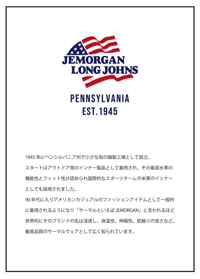 1945年にペンシルバニア州で小さな町の縫製工場として設立されたJEMORGANは、アウトドア用のインナー製品として着用され、国際的なスポーツチームや米軍のインナーとしても採用されました。