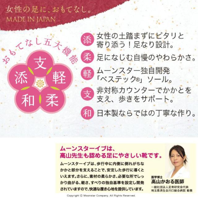 アクティブなミセスの足元をサポートする「ムーンスターイブ」のコンフォートシューズです。日本製ならではの丁寧で、きめ細やかな作りが魅力です。
