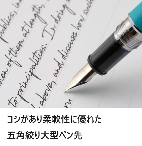 ◆コシがあり柔軟性に優れた五角絞り大型ペン先… ほどよくしなることで、ステンレス製でありながらも金ペンの様な書き心地を実現しています。