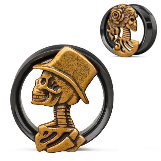 黒色ブラックにメッキされたダブルフレアにアンティークゴールドのドクロの新郎と新婦を1セットにしたボディピアス。骸骨の花嫁とシルクハットをかぶった骸骨がユニークなホール系ボディピアス。