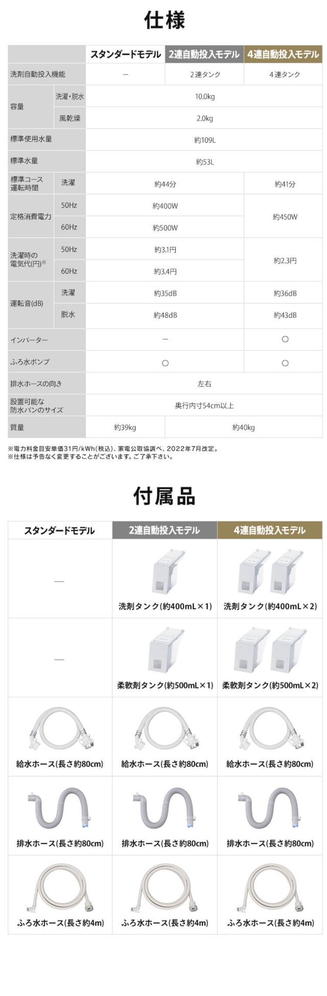 液体洗剤タンク(400mL)2個、柔軟剤(500mL)タンク2個を搭載。