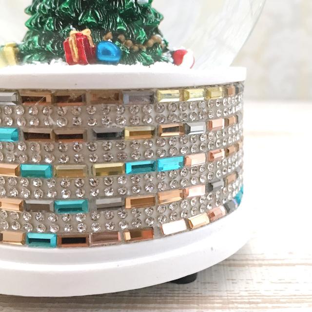 煌びやかなベースのクリスマスツリーのオルゴール付きスノードーム。 |