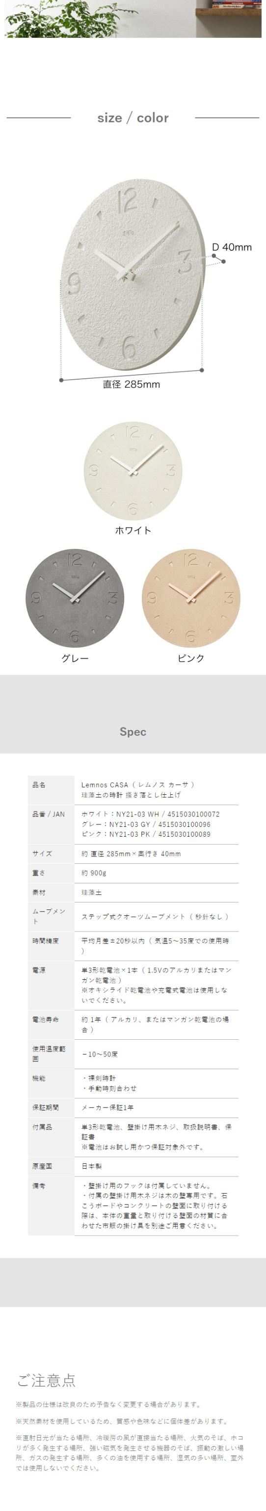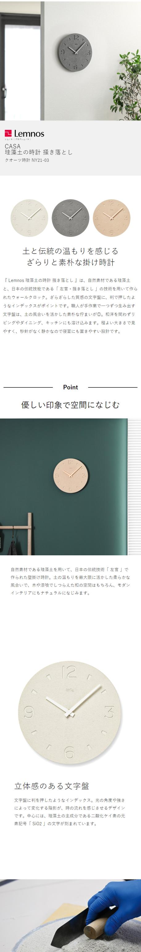 [ CASA 珪藻土の時計 掻き落とし仕上げ ]レムノス 掛け時計 壁掛け時計 珪藻土 おしゃれ シンプル ウォールクロック 壁掛け 掛時計 かけ時計 北欧 リビング インテリア タカタレムノス NY21-03 sio2【送料無料】
