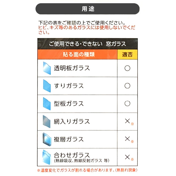 使用できない窓ガラス網入りガラス、複層ガラス、合わせガラスの窓ではお使いいただけません。温度変化でガラスが割れる場合があります。
