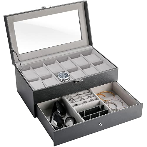 ProCase 腕時計ケース 12本用、腕時計&ジュエリー 収納ボックス、ディスプレイケース 小物整理 取外し可能な土台 贈り物- ブラック