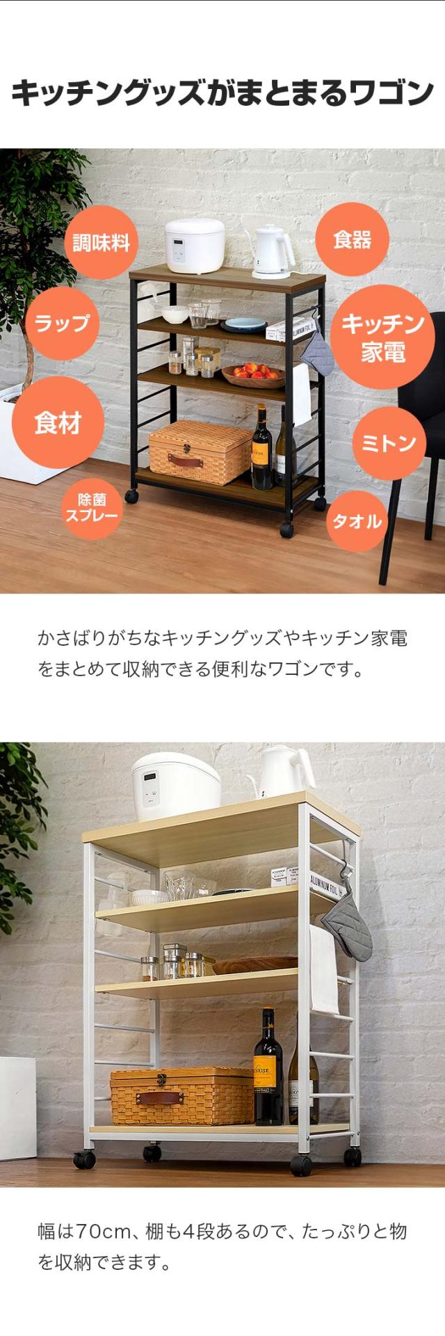 キッチンワゴン キャスター付き 天板付き スリム 高さ調節 4段 幅70cm×奥行30cm 木目調 隙間収納 キッチンラック キッチン収納 ラック ワゴン ストッカー ワゴンラック マルチワゴン サイドラック 収納 キッチン 台所 おしゃれ 1年保証 送料無料
