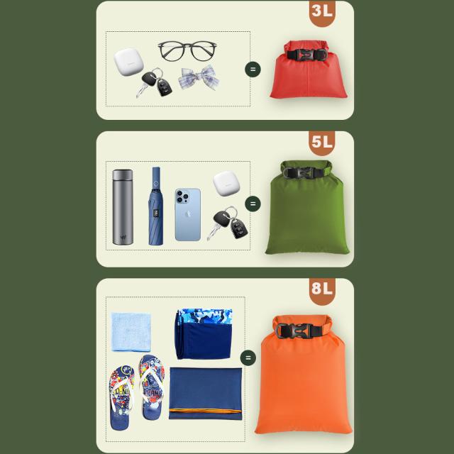 コンパクトに折りたためる、ロールトップ式ドライサックお得な3L、5L、8Lの3サイズセットです。