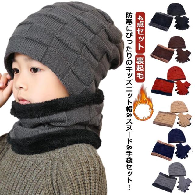 ニット帽 ネックウォーマー 手袋 キッズ 4点セット 帽子 ニット マフラー スヌード てふくろ 子供 裏ボア 裏起毛 厚手 男の子 女の子 子ども ベビー 幼児 ジュニア 小学生 冬 あったか 暖かい 防寒 防風 もこもこ ゆったり おしゃれ 無地 黒 赤