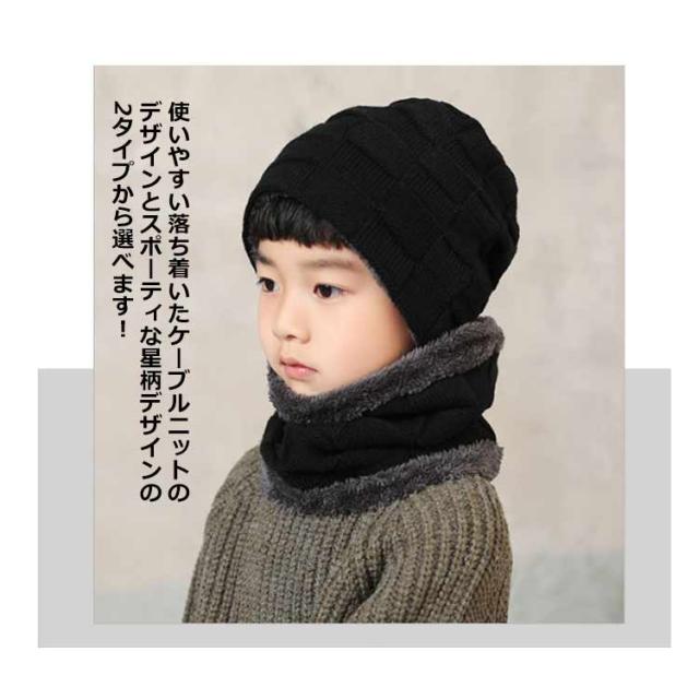 | 4点セット 防寒にぴったりのキッズニット帽&スヌード&手袋セット! スヌードは裏ボアになっているので首元がとても暖かいです。 使いやすい落ち着いたケーブルニットのデザインとスポーティな星柄デザインの2タイプから選べます! | |