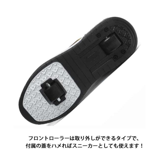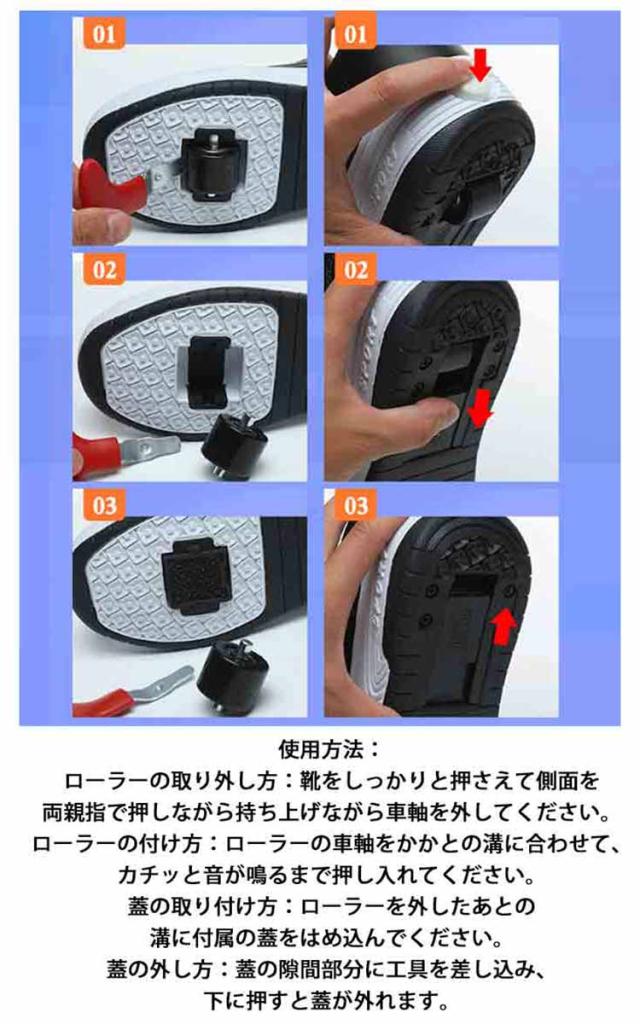 | 大人気のジュニアローラーシューズです。 安定した滑りが可能で色々なテクニックがやりやすくなっています。 かかとになるボタンを押すと後輪を隠すことができます。 フロントローラーは取り外しができるタイプで、付属の蓋をハメればスニーカーとしても使えます! 使用方法: ローラーの取り外し方:靴をしっかりと押さえて側面を両親指で押しながら持ち上げながら車軸を外してください。 ローラーの付け方:ローラーの車軸をかかとの溝に合わせて、カチッと音が鳴るまで押し入れてください。 蓋の取り付け方:ローラーを外したあとの溝に付属の蓋をはめ込んでください。 蓋の外し方:蓋の隙間部分に工具を差し込み、下に押すと蓋が外れます。 | |