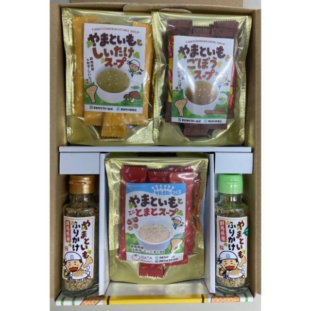 ギフト商品としても人気のある『やまといも』を乾燥加工し、『やまといも顆粒』・『やまといもパウダー』を使用した『やまといもふりかけ(2種)』・『やまといもスープ(3種)』のギフトセットになります。