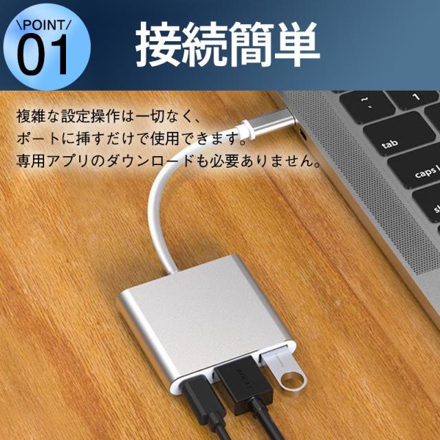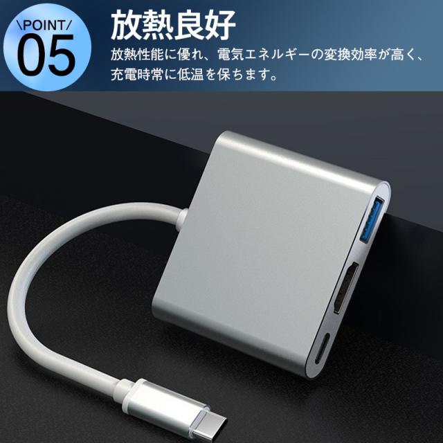 ●HDMI変換アダプターにはUSBポート、HDMIポート、Type-Cポートが各一つを搭載しています。