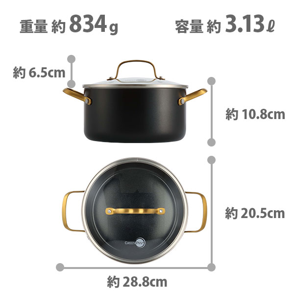 ブラックのボディとゴールドのハンドルの上品なデザインは、調理後そのまま食卓にサービングするのもおすすめです。