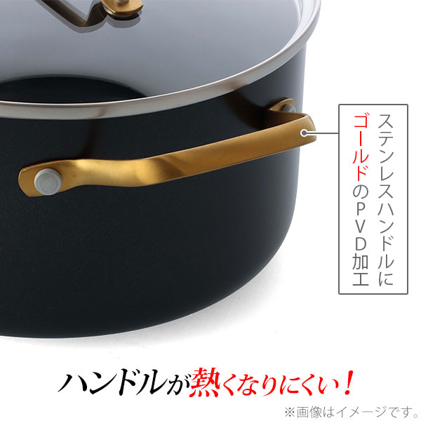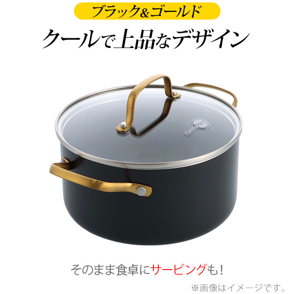 ブラックのボディとゴールドのハンドルが洗練されたデザインの、「ストゥディオ」シリーズの両手鍋です。