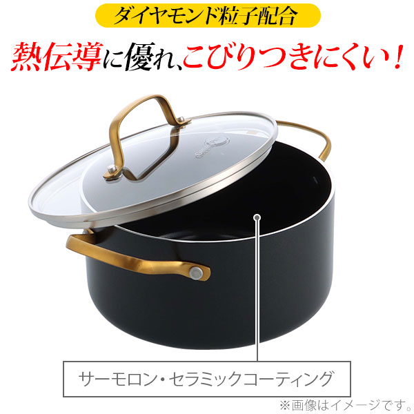 ノンスティック・セラミックコーティングが施され、熱伝導に優れたこびりつきにくい両手鍋です。