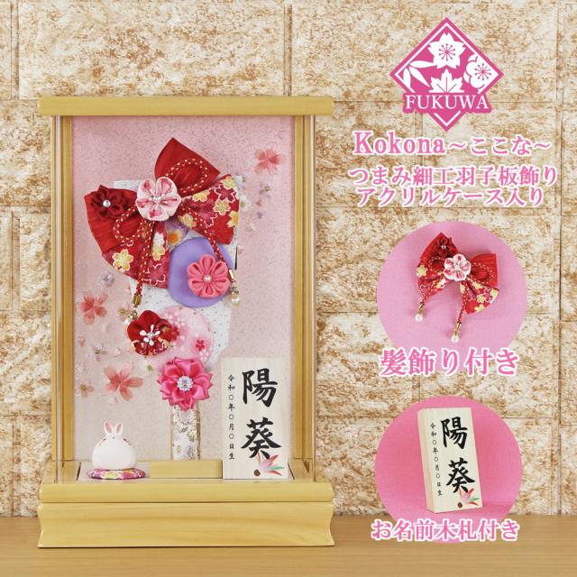 羽子板 初正月 花飾り(7号 摘み細工 髪飾り付き つまみ細工 羽子板飾り(赤)ここな 桧 アクリルケース入り)FUKUR3-157A お祝い ミニ コンパクト おしゃれ