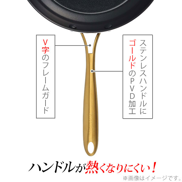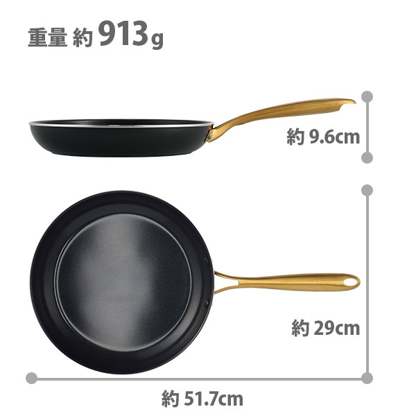 ハンドルが中空になっているので軽く、調理やお手入れをしやすい点も嬉しいポイントです。 ブラックのボディとゴールドのハンドルの上品なデザインは、調理後そのまま食卓にサービングするのもおすすめです。