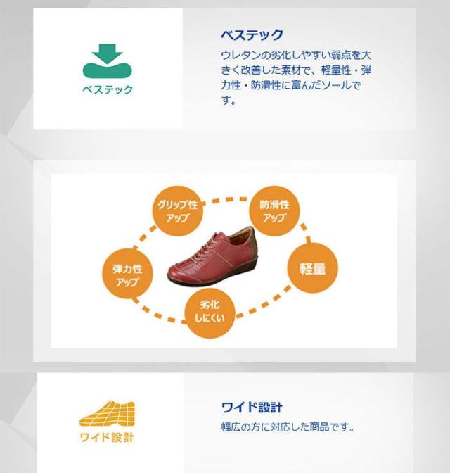 ウレタンの劣化しやすい弱点を大きく改善した素材で、軽量性、弾力性、防滑性に富んだソールです。