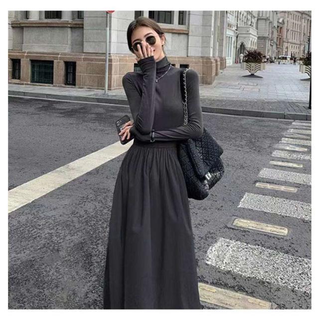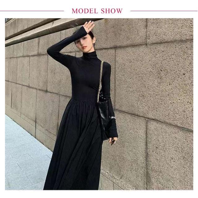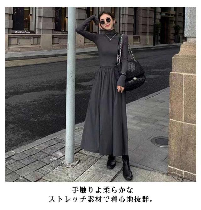 マキシワンピース Tシャツワンピース ハイネック マキシ丈 フレア レディース タイトワンピ ロングワンピース タートル マキシ フレアワンピース Aライン タートルネック フォーマル シンプル きれいめ 小顔 ブラック 黒 秋 冬 お呼ばれ