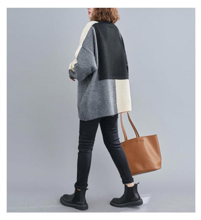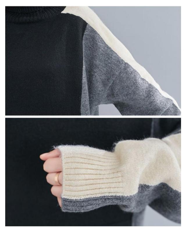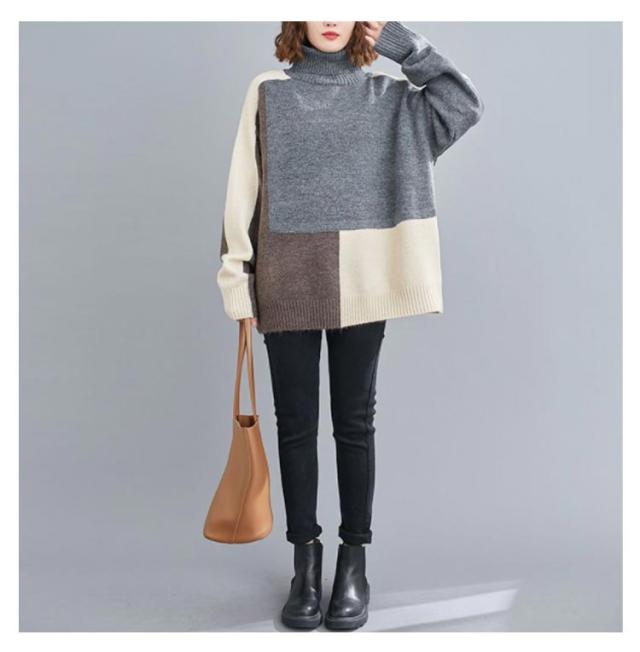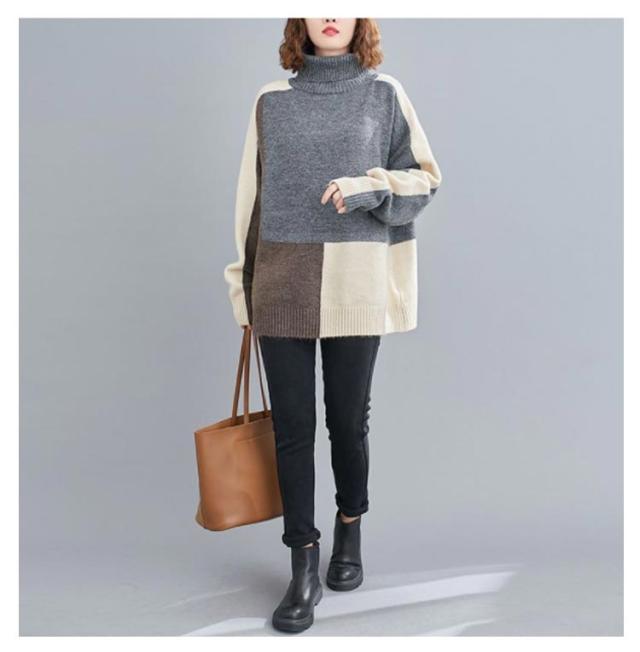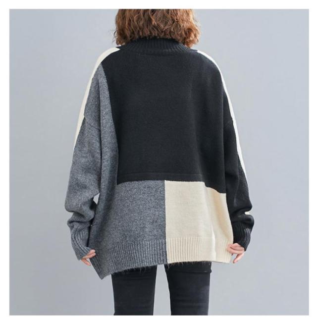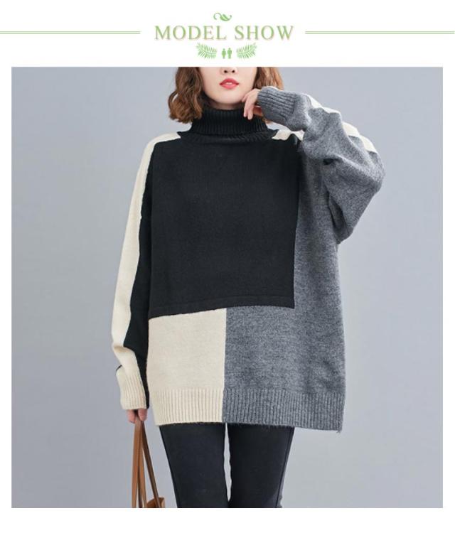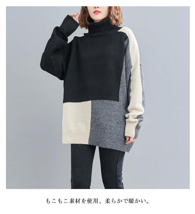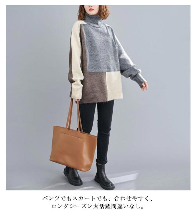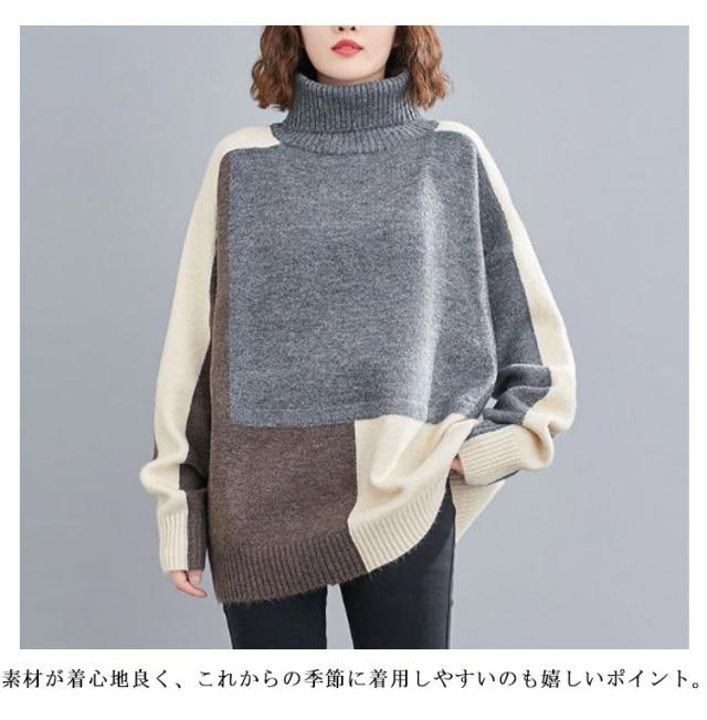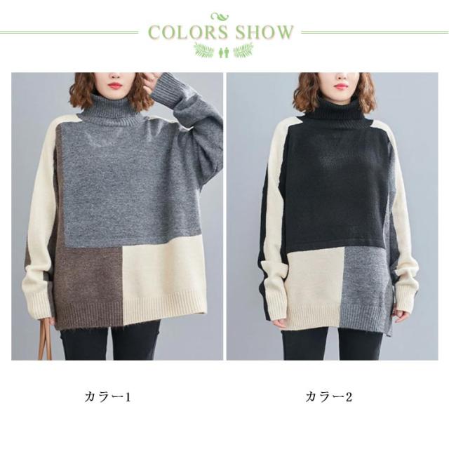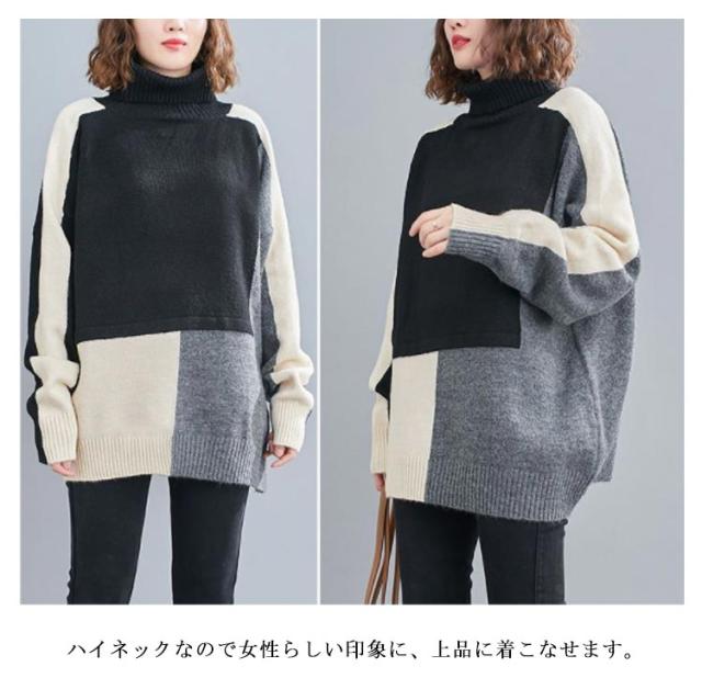 配色 セーター レディース ビッグシルエット ハイネック ニット チュニック ニットセーター トップス 秋冬 長袖 タートルネック ゆったり 大きいサイズ 体型カバー カジュアル M L XL