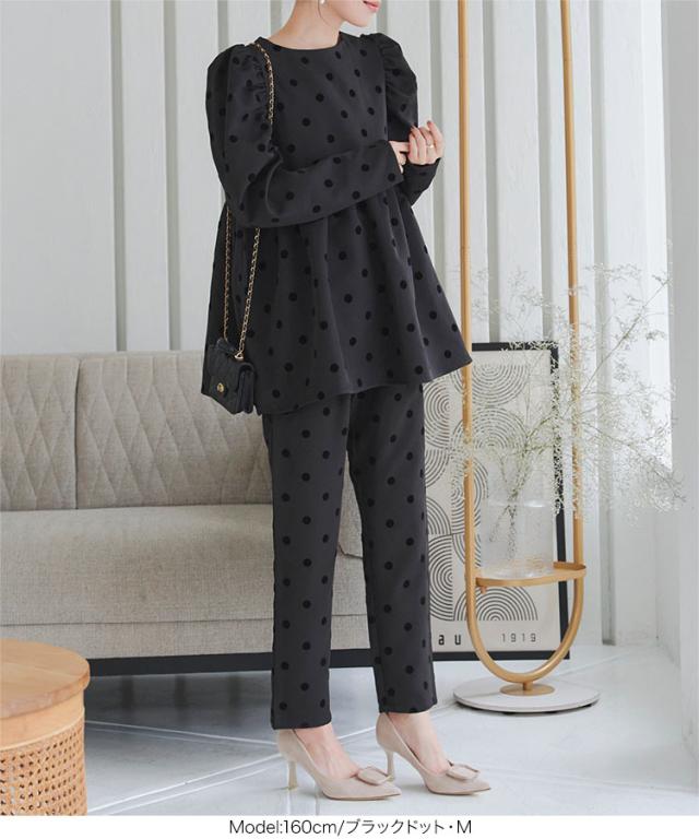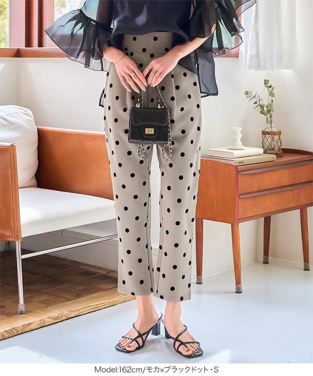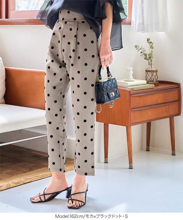 春新作 フロッキードットハイウエストパンツ M3980 入荷済 細見え 着痩せ ドットパンツ ドットズボン ドットボトム 水玉 フロッキー加工 カジュアル きれいめ オフィスカジュアル 高見え 美シルエット高級感 履きやすい 快適