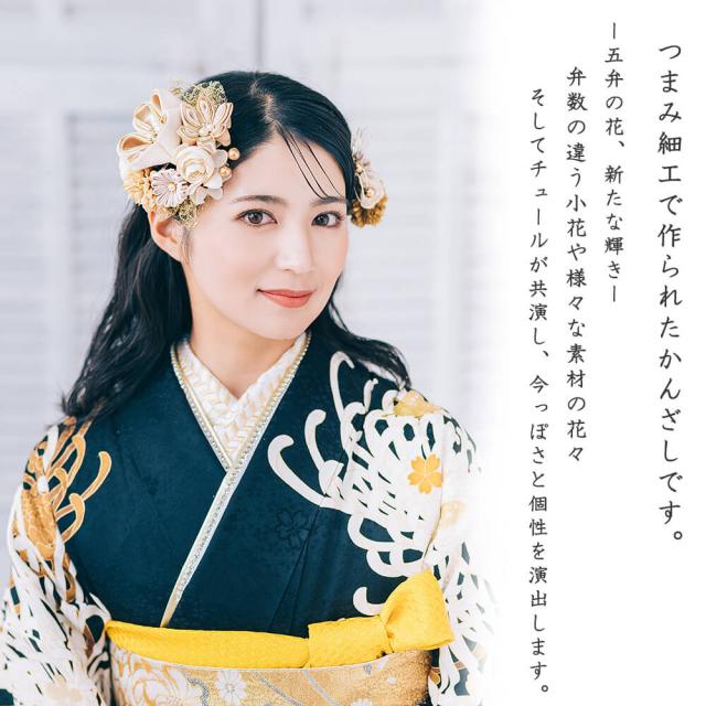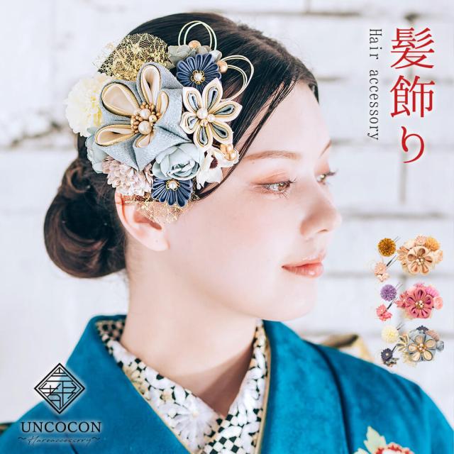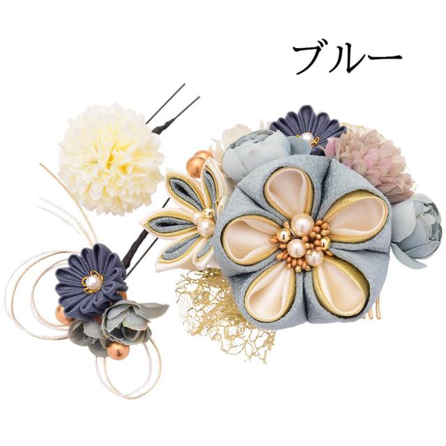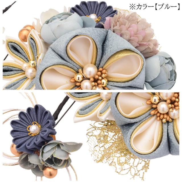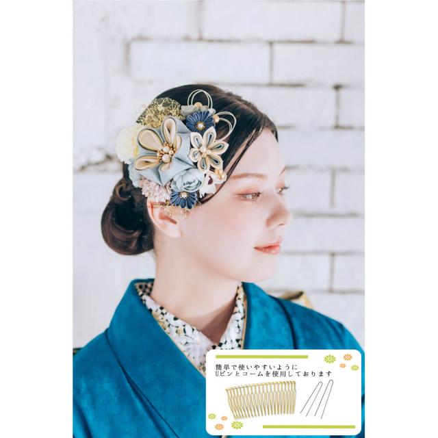 髪飾り かんざし 成人式 つまみ細工 チュール 振袖 前撮り 袴 花 ベージュ ブルー 大きい Uピン コーム ウエディング
