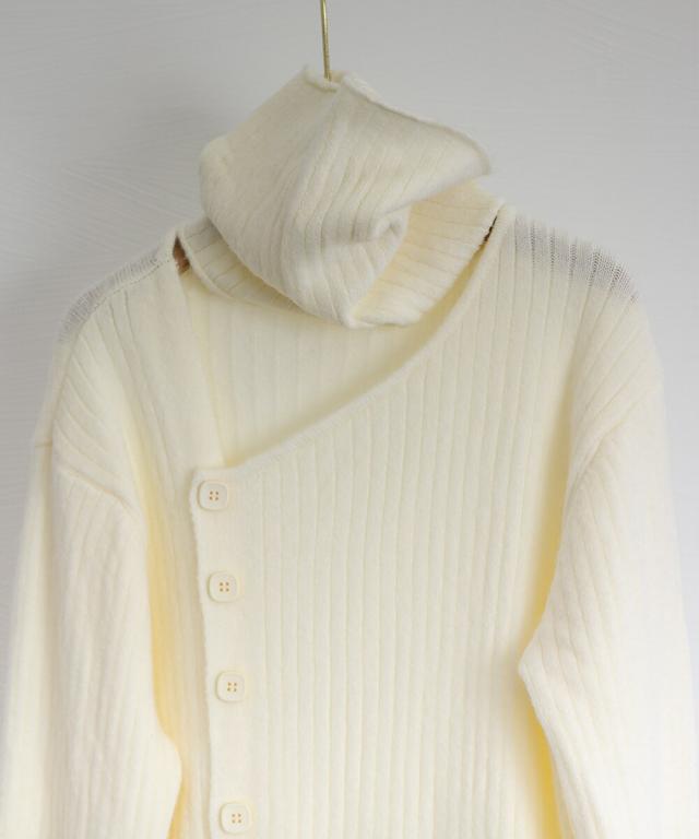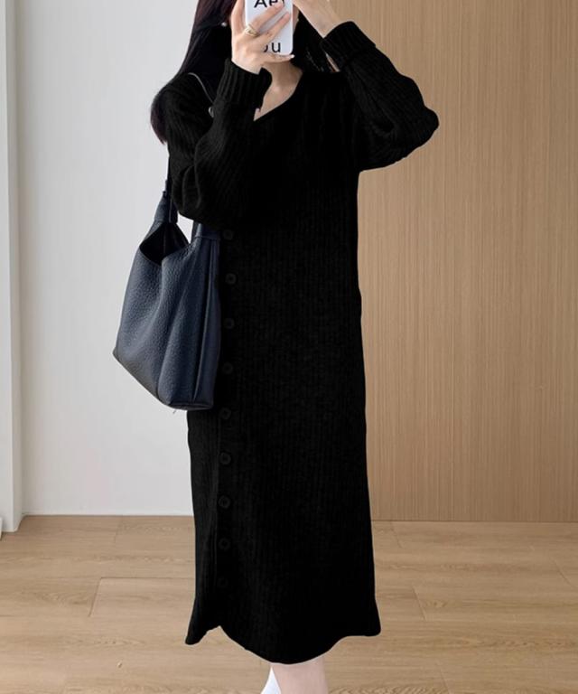 フロントボタンがアクセントに、リブ編みが縦のラインを強調し、ボディラインを美しく見せてくれるリブニットロングワンピース