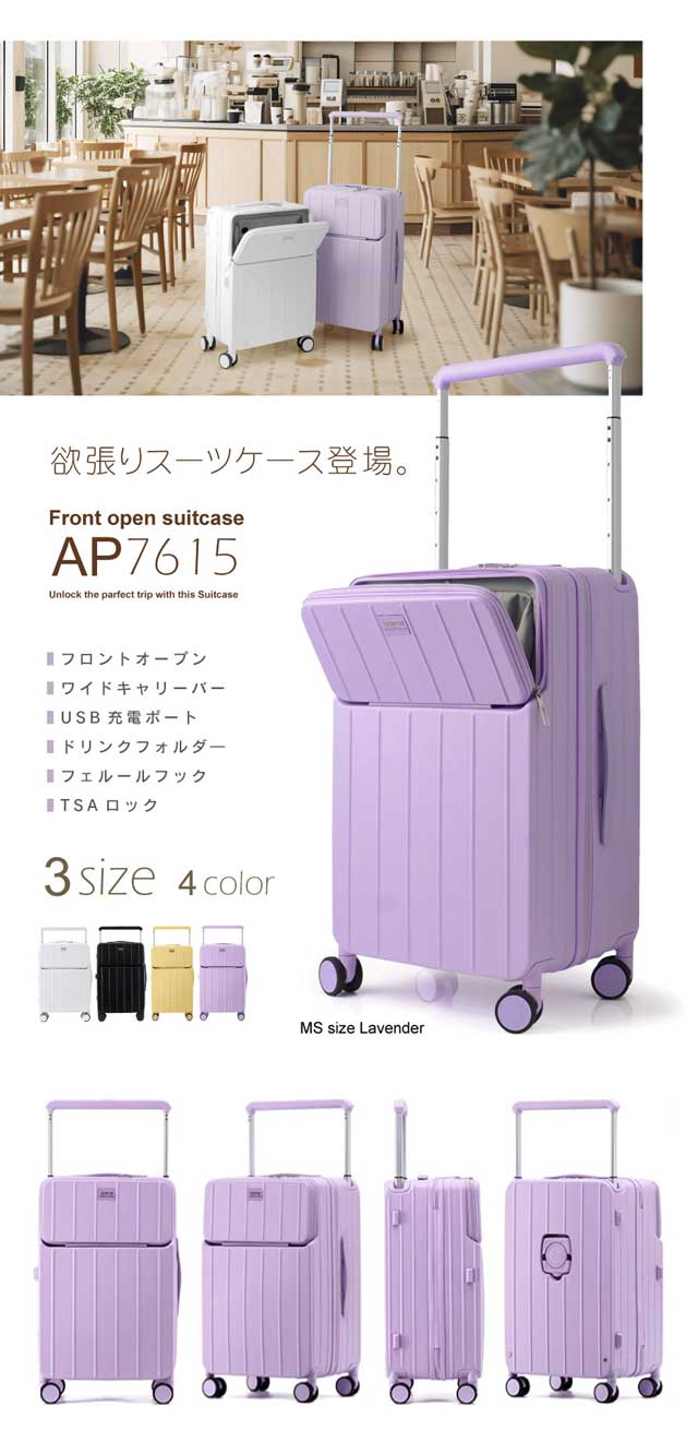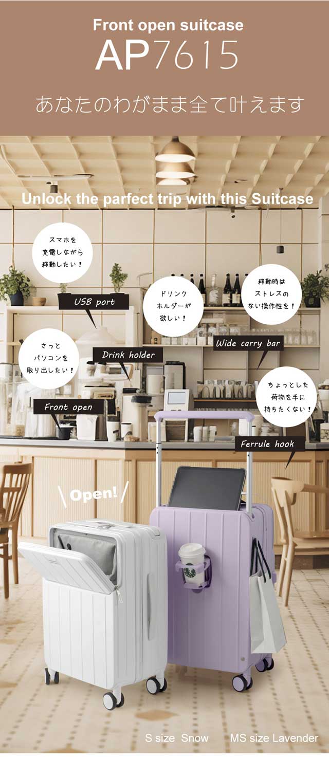 今人気の要素を詰め込んだ キャリーケース フロントオープン 前開き スーツケース ワイドキャリーバー USBポート付き ドリンクホルダー キャリーバッグ MSSサイズ 大容量 多収納ポケット トランク 修学 海外 国内旅行 送料無料 AP7615