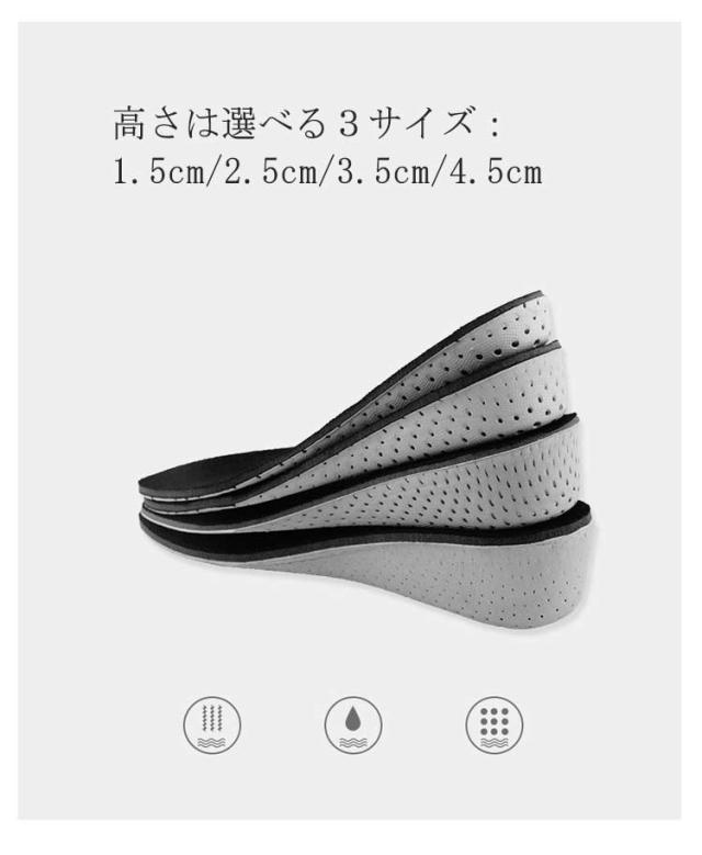 | 1.5cm/2.5cm/3.5cm/4.5cmアップ!男女兼用シークレットインソール 中敷きとしてお手持ちの靴に入れるだけで簡単にヒールアップしてくれます。 外から見てわからないまま、足が長く、姿勢良く、身長アップ &スタイルアップすることができます。 高さは選べる3サイズ:1.5cm/2.5cm/3.5cm/4.5cm 通気性がよく、長時間履いていても蒸れづらく気になる臭いがおさえられます。また、水に強くクッション性があり、衝撃を吸収し、長時間のご使用でも体への負担なく快適に歩いていただけます。 インソール裏のガイド線に沿ってハサミでカットして簡単にサイズ調整できます。 衝撃吸収型のソフトクッションを搭載しておりますので、通勤時や立ち仕事など様々なシーンでお使いいただけます。 選べる2タイプ、ニーズに合わせてお選びいただけるのもうれしい♪ | |