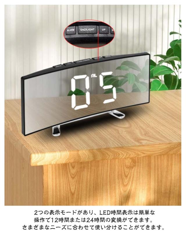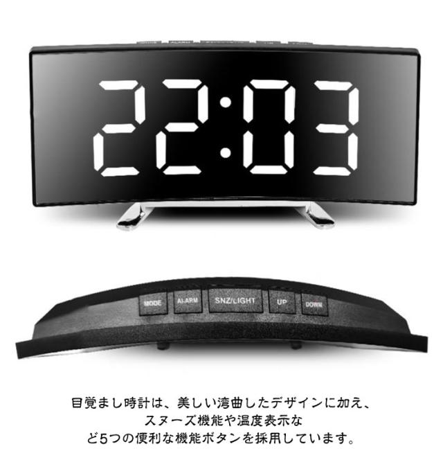 デジタル時計 目覚まし時計 ナイトモード 卓上 置き時計 卓上時計 LEDアラーム時計 デジタル表示 LED表示 USB給電 ミラー時計 スヌーズ機能 曲面パネル 曲面スクリーン 目覚まし時計 アラーム機能 日付表示 温度表示