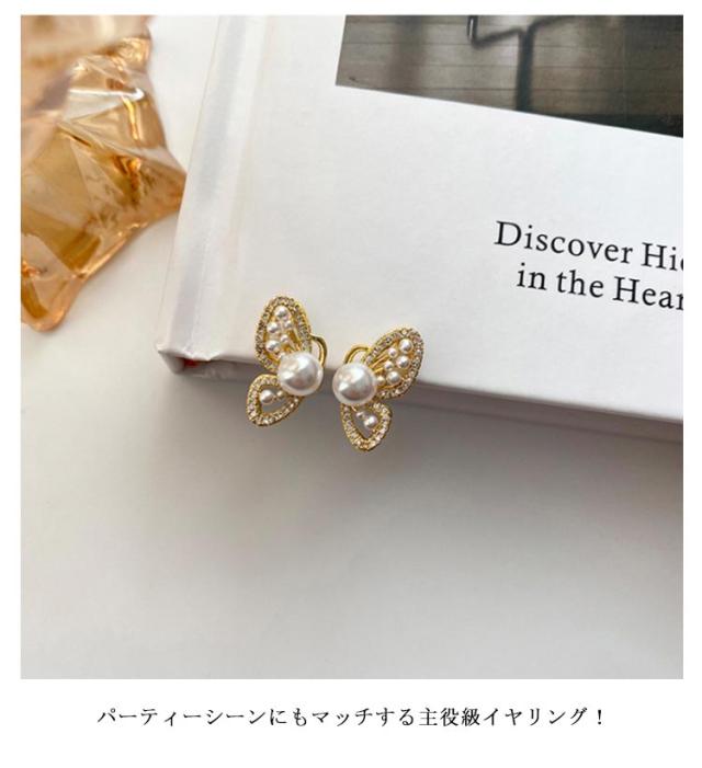 蝴蝶 バタフライ イヤリング ジルコニア ビジュー イヤリング ピアス見え キラキラ パール イヤリング レディース アクセサリー 高見え 金属アレルギー対応 ノンホール 送料無料