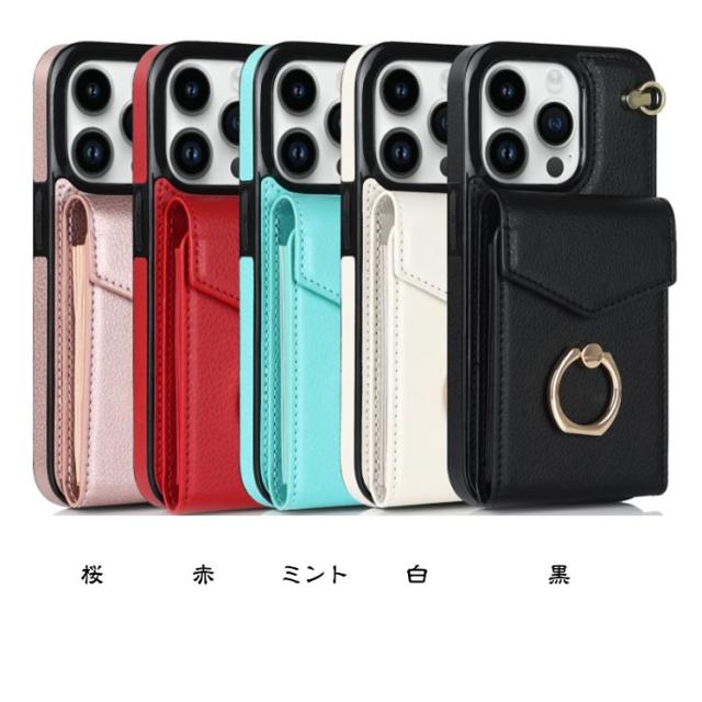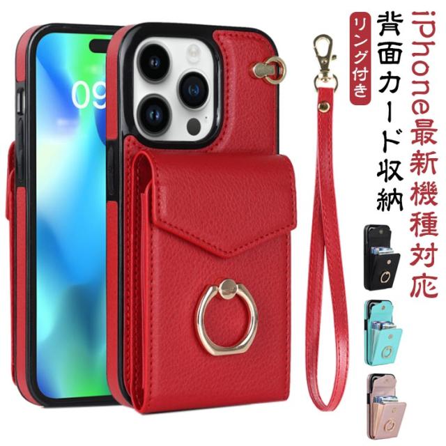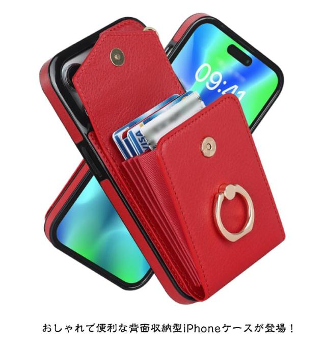 ストラップ付き iPhone15 ケース 背面収納 背面ポケット ケース カバー スマホケース 落下防止 リング付き スマホリング 背面 カード収納 カード入れ 背面 カードポケット iPhoneケース 送料無料