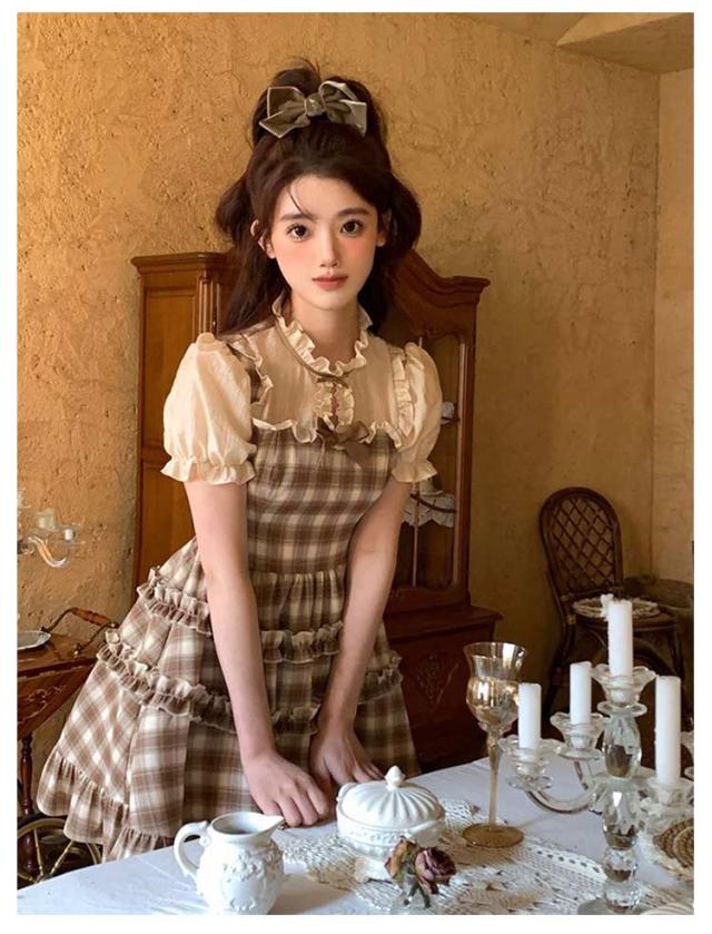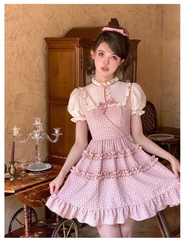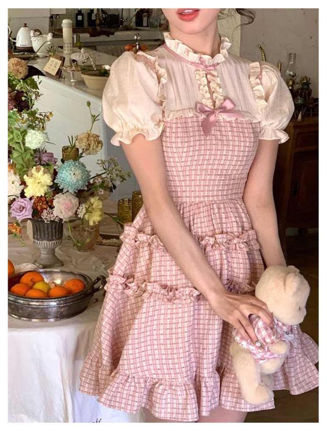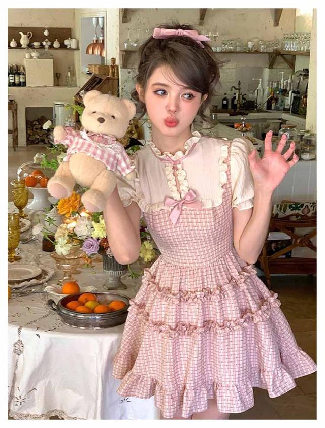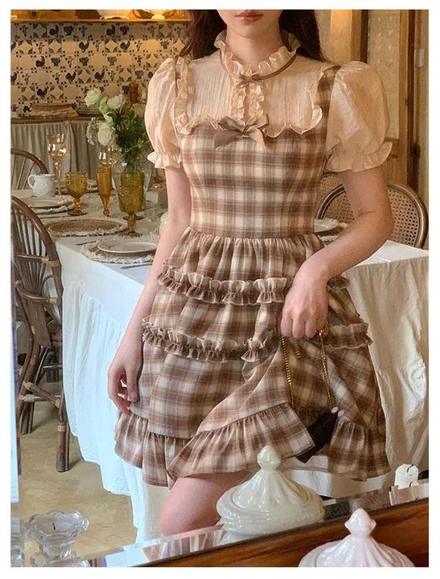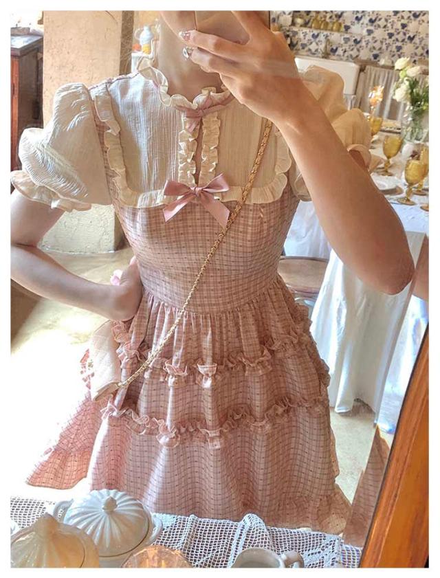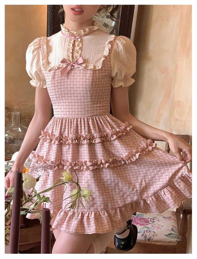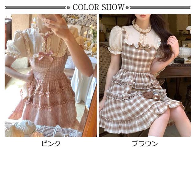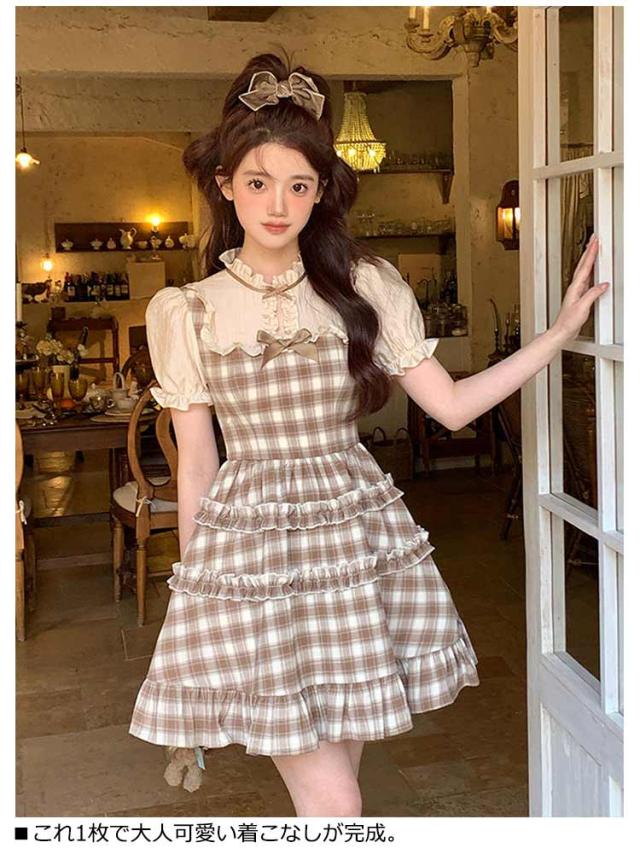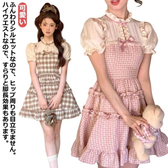 ワンピース レディース サマーワンピース フレアワンピース ショート丈 プリーツ 袖フリル フリルショルダー 半袖 チェック柄 蝶結び aライン クルーネック ロリータ風 レトロ 薄手 ゆったり きれいめ 可愛い お洒落 かわいい
