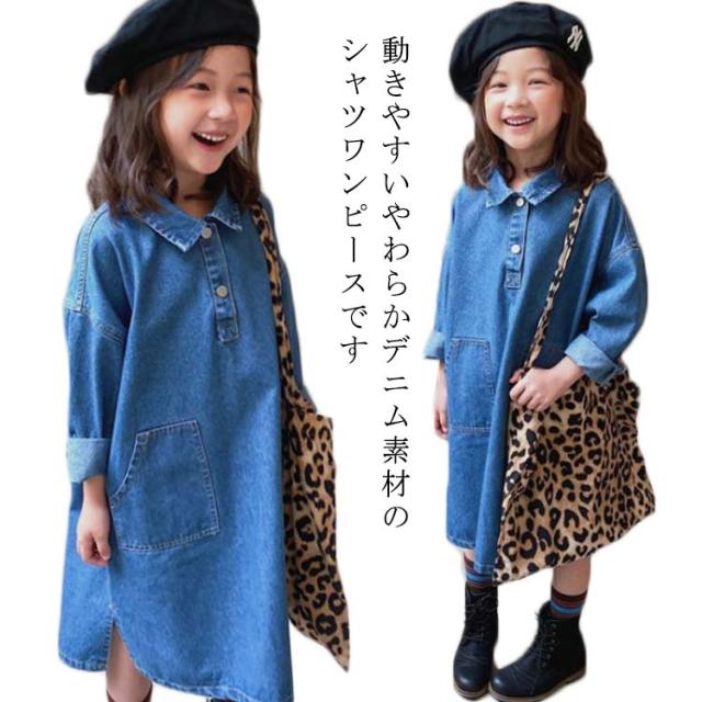 デニム ワンピース キッズ 長袖 デニムシャツワンピース シャツワンピ デニムワンピース ロング 子供服 女の子 デニム ジュニア 韓国子供服 小学生 可愛い 大人っぽい 通園 通学 ひざ丈 膝丈 ミディアム丈 ポケット 90 100 110 120 130 140 春 夏 秋 冬 送料無料