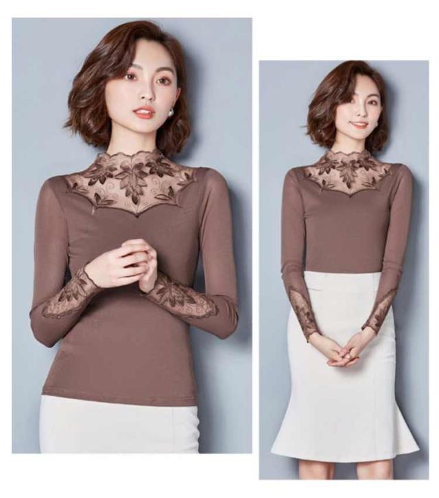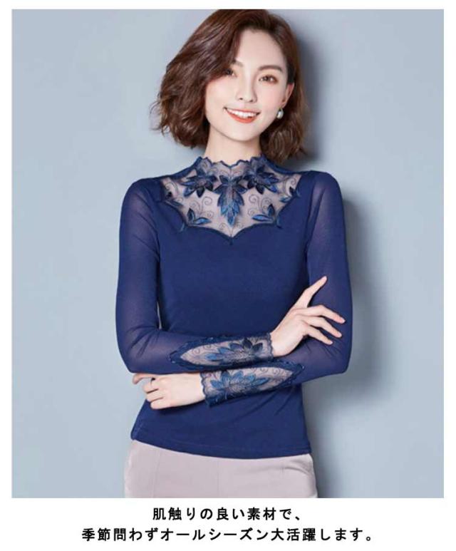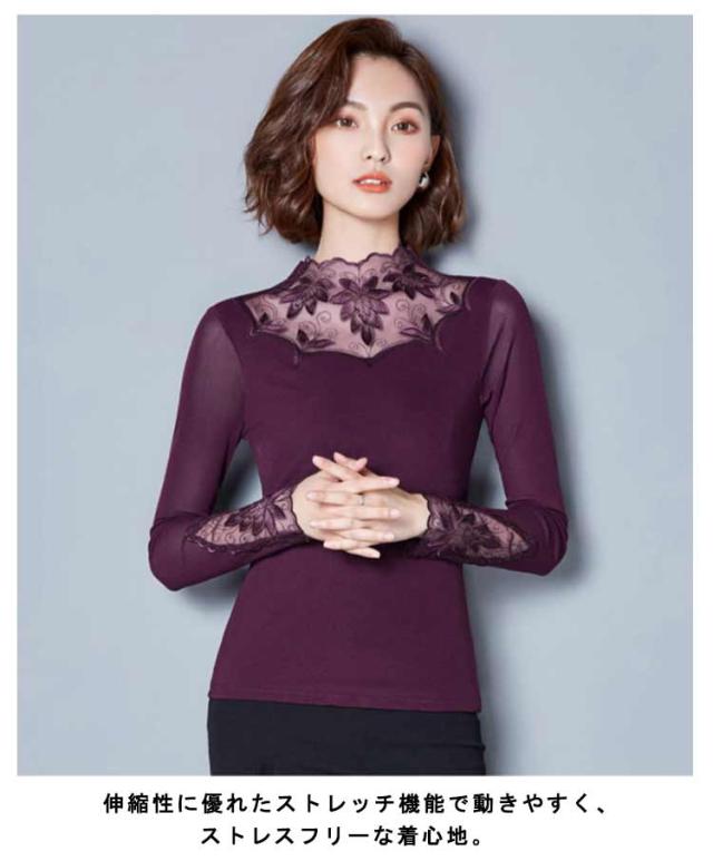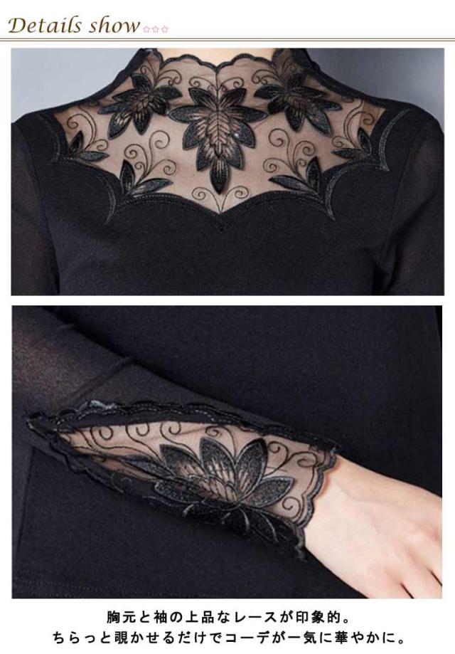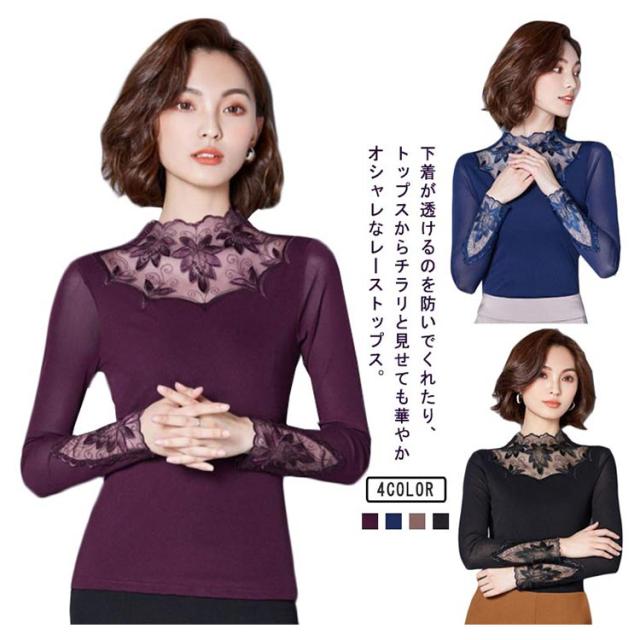 カットソー レース インナー レイヤード レディース 長袖 トップス モックネック ボトルネック 長袖tシャツ ロンT 長袖カットソー レース切り替え 透けない ストレッチ インナートップス コーデ 重ね着 韓国 きれいめ 大人 可愛い 茶色 黒 【送無】