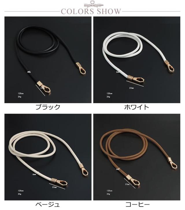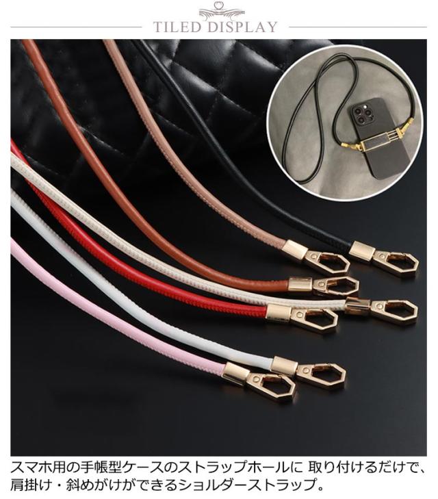 | 全長120cm スマホ用の手帳型ケースのストラップホールに 取り付けるだけで、 肩掛け・斜めがけができるショルダーストラップ | |